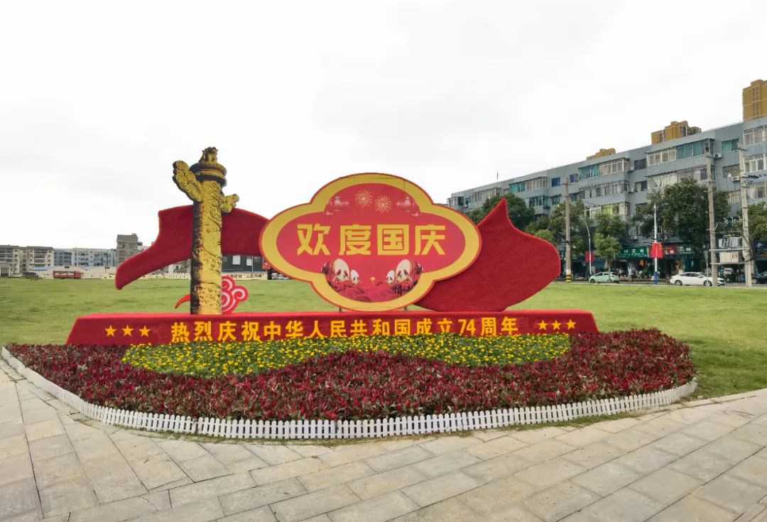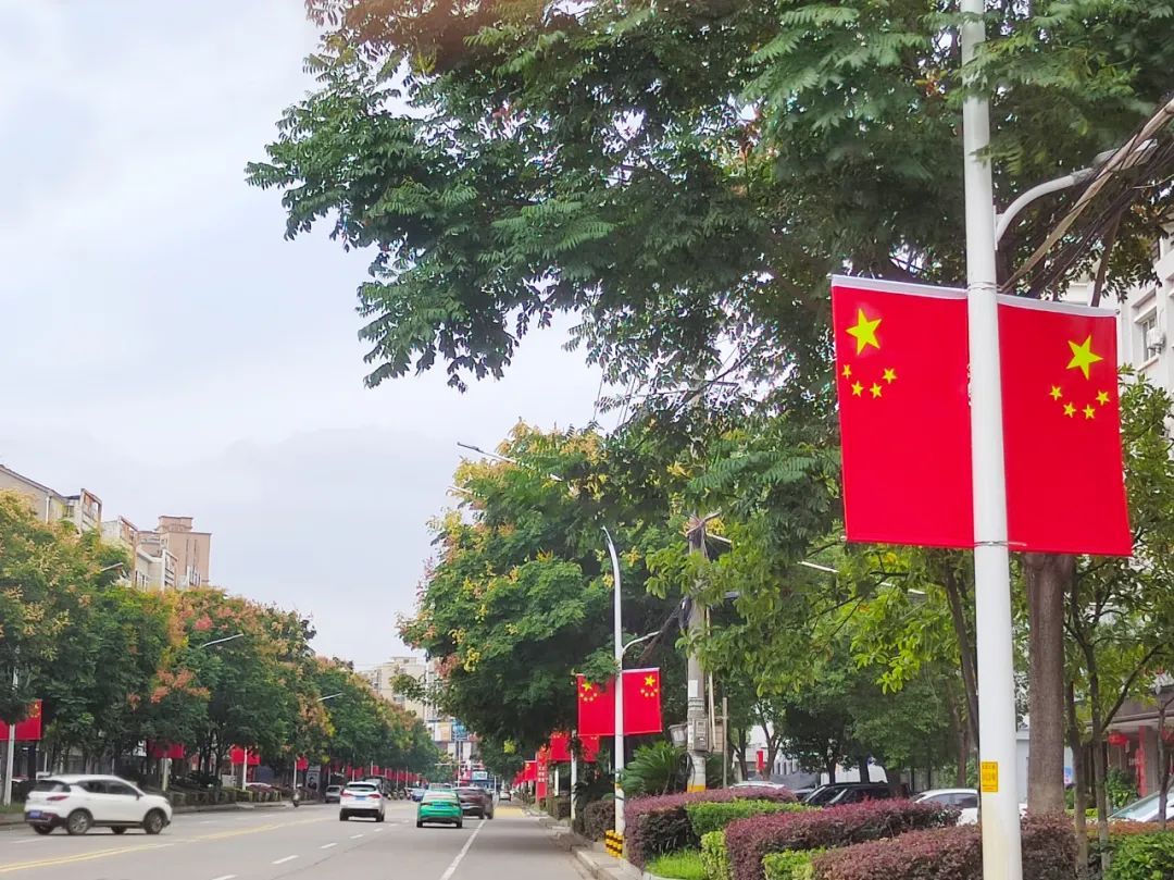 在全民健身中心、高速连接线、沿江大道、老市标转盘、二桥出口等5处路口,布置了迎国庆题材主题小品雕塑;在中心城区道路两侧,悬挂国旗1783套……一抹抹“中国红”挂上街头,热烈、喜庆、欢乐、祥和的节日氛围扑面而来。