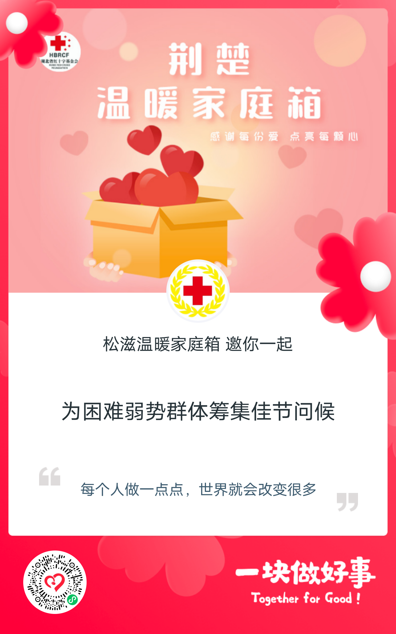 为积极践行社会主义核心价值观,弘扬“人道、博爱、奉献”的红十字精神,倡导“我为人人,人人为我”的公益理念,松滋市红十字会在省红十字会发起举办的第三届“湖北数字公益节”网络筹资活动中,依托腾讯公益平台,推出“松滋市红十字会温暖家庭箱”一起捐众筹项目。