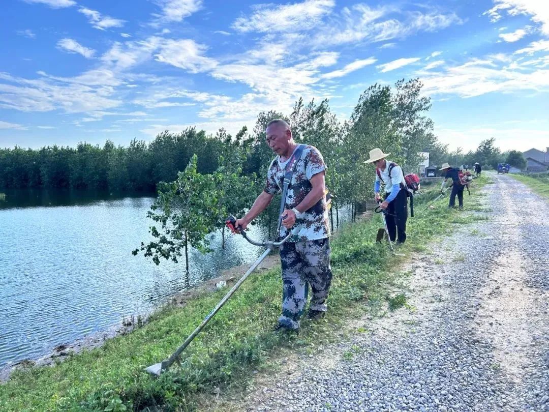 烈日当空,他们背着十几斤的割草机坚定地行走在河堤上,身上的衣服干了又湿,湿了又干,脸被晒得通红,却没有一人抱怨,认真地清除堤面杂草。“我们是‘疯狂’割草人。”他们相互打趣。