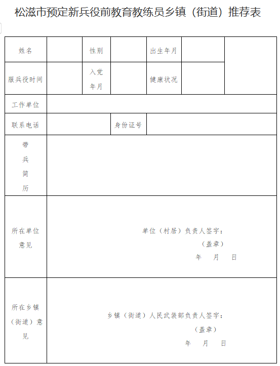 1.填报《松滋市公开选拔预定新兵役前教育教练员申请表》2份、《松滋市预定新兵役前教育教练员乡镇(街道)推荐表》2份(所在单位或村居、基层武装部加盖公章)、近期1寸同版彩色免冠正面照片4张;