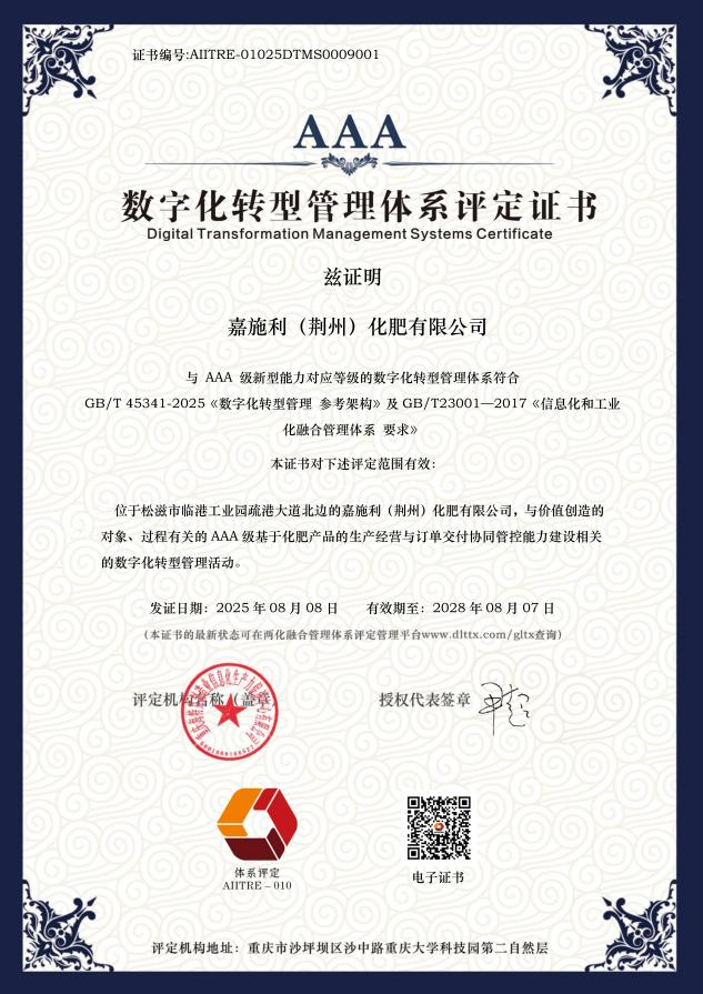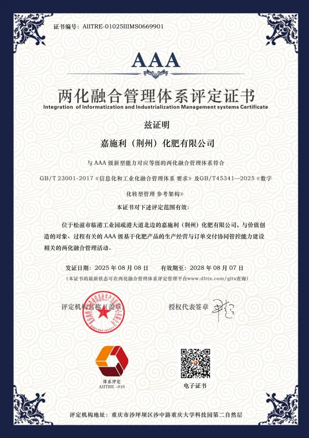 嘉施利(荆州)化肥有限公司是云图控股旗下的全资子公司,主要产品为磷酸一铵和复混肥料等系列产品。公司拥有相关专利53项,其中发明专利5项,已通过质量管理体系、职业健康安全管理体系、环境管理体系的认证,是湖北省隐形冠军企业、2024年湖北省制造业100强企业。
