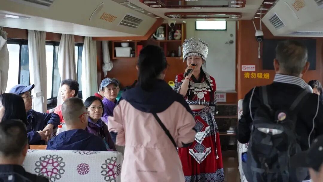当天下午,旅行团抵达后即开启湖上观光。游船行过如镜的水面,两岸风光如水墨画卷般徐徐展开。独具特色的“跑四回”民俗表演以山水为幕、船舷为台,游客在湖光山色中互动体验,感受荆楚民俗的独特魅力。