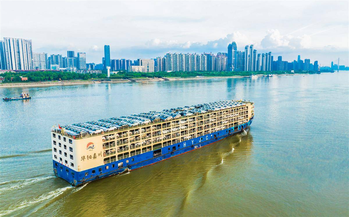 满载汽车的货轮行驶在长江武汉段。(湖北日报全媒记者 薛婷 摄)