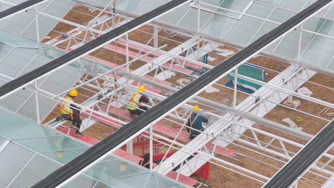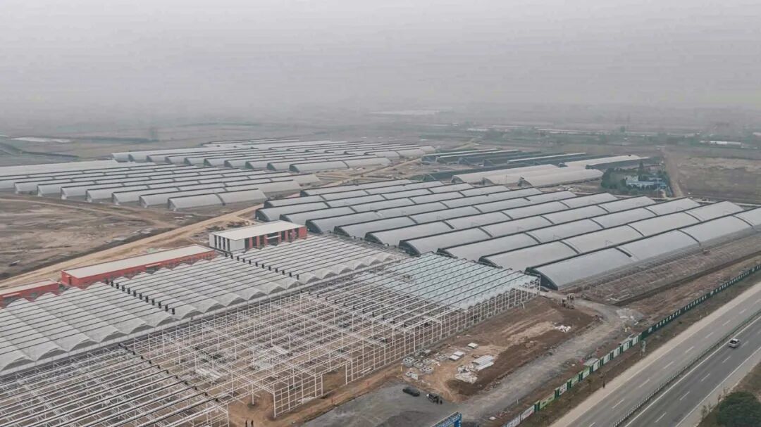 项目规划占地1100亩,自6月动工以来建设迅速。目前,核心区分拣包装车间与配套用房已基本建成,现代化的玻璃温室与薄膜连栋育苗温室主体巍然矗立。首批投产的11栋日光温室大棚内,番茄、彩椒、草莓等五大类共50多个品种的瓜果蔬菜生机盎然,首批产品将于春节前上市。