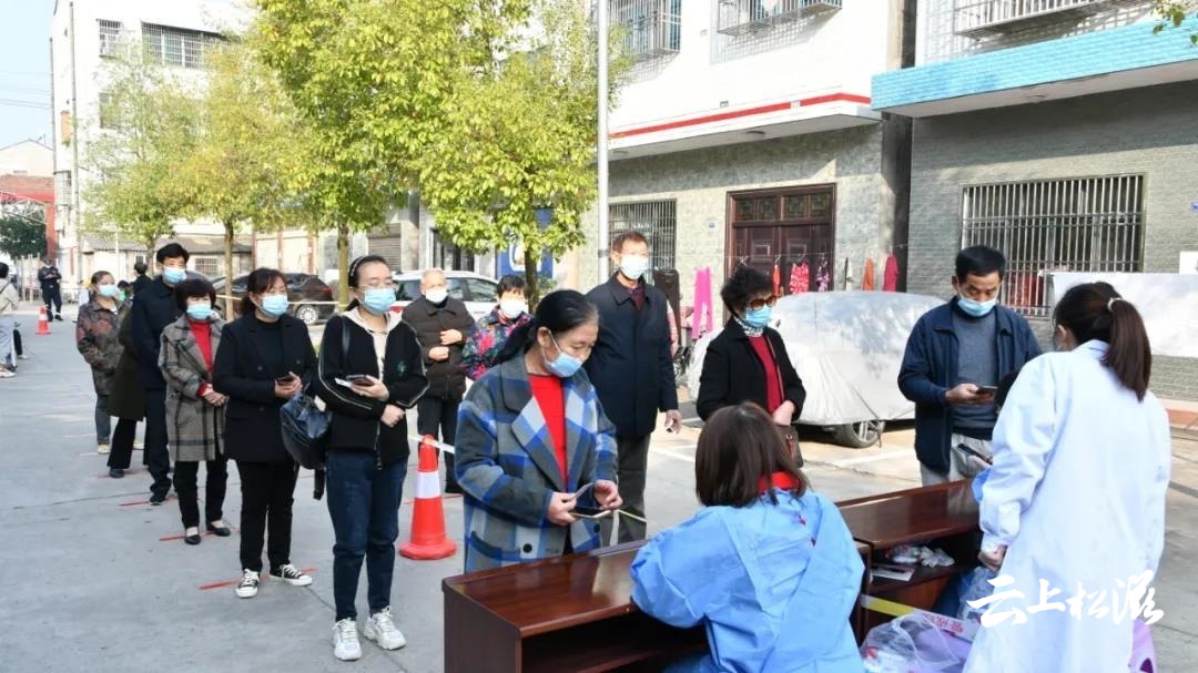 在新江口街道同心桥社区核酸检测点,受检人员在社区工作人员的引导下排队扫码入场,并在等候区登记信息。截至上午11时,410名次密接人员及一般接触人员均已完成核酸检测。