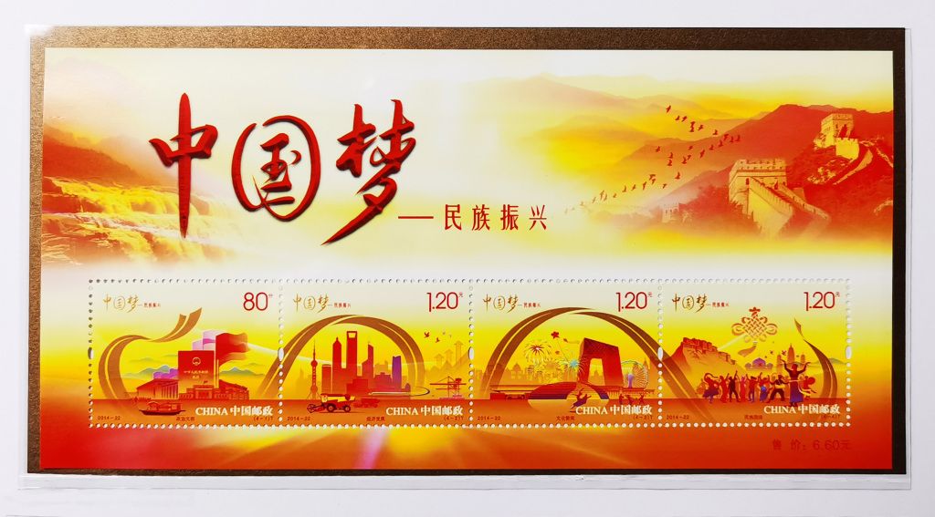 中国邮政于2014年9月20日发行《中国梦——民族振兴》特种邮票,一套4枚,小全张1枚。邮票内容分别为政治文明、经济发展、文化繁荣、民族团结,画面采用与国旗一致的红黄色调,一条腾飞的金丝带贯穿首尾,展现了改革开放以来,我国在政治、经济、文化等方面所取得的辉煌成就,表现了全国各族人民团结一心,汇聚起实现中华民族伟大复兴的中国梦的磅礴伟力。