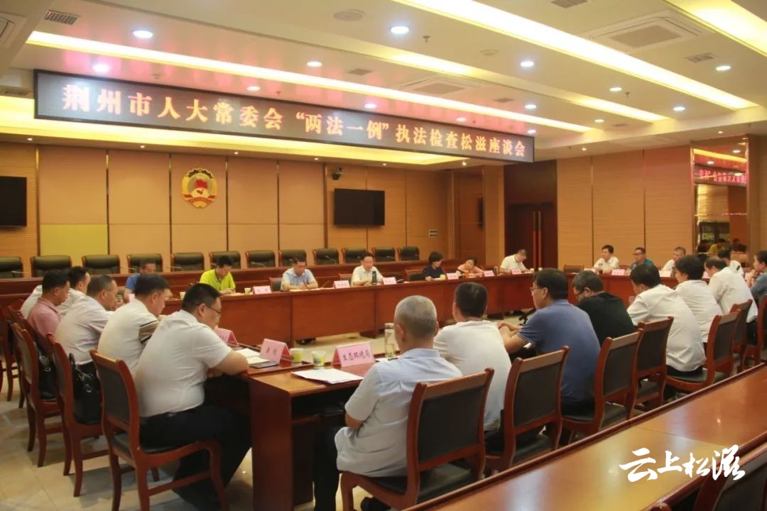 检查组一行先后来到涴市镇、八宝镇、稻谷溪湿地公园、松滋市船舶垃圾污水港口接收专用码头,调研长江岸线复绿、码头整治、生态修复整治、水生态保护及产业发展、项目建设等情况。座谈会上,检查组听取了我市“两法一例”贯彻实施情况报告,并征求部分人大代表的意见建议。