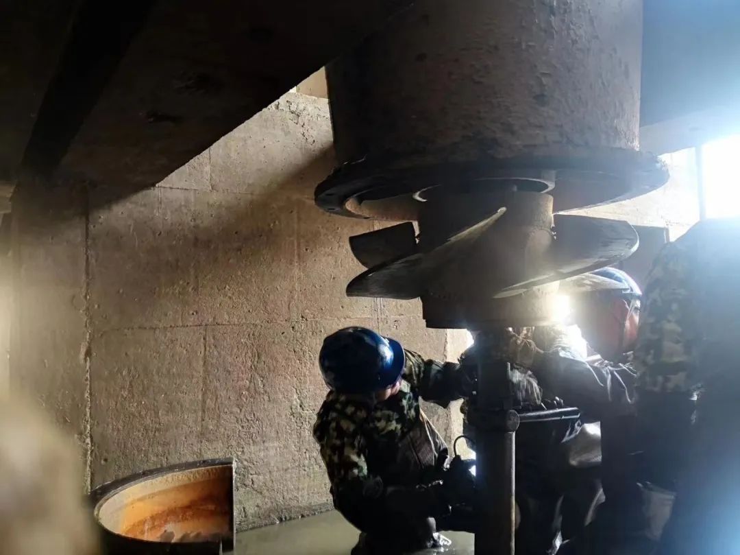 (记者 陈俊龙)在沙道观镇跃进站泵站,工作人员分成两组对泵机主体进行拆卸检修,尽管气温较低,施工一片忙碌……