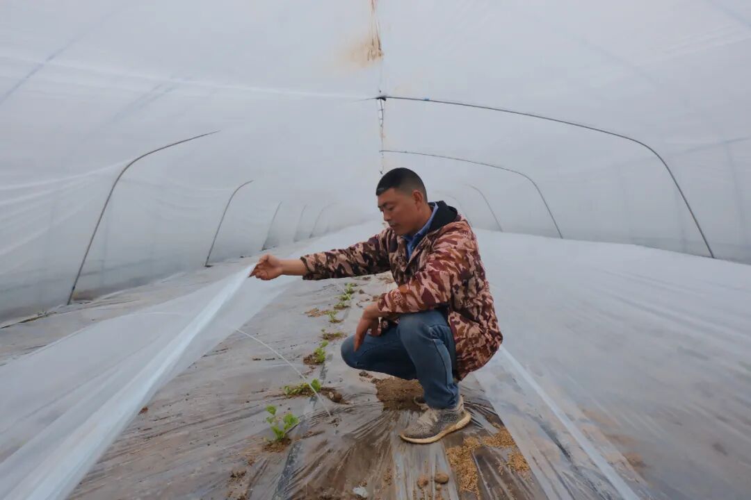 ▲尤太勇查看幼苗长势
