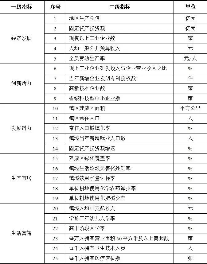 全国建制镇综合实力指数下设经济发展、创新活力、发展潜力、生态宜居、生活富裕5个一级指标、25个二级指标。