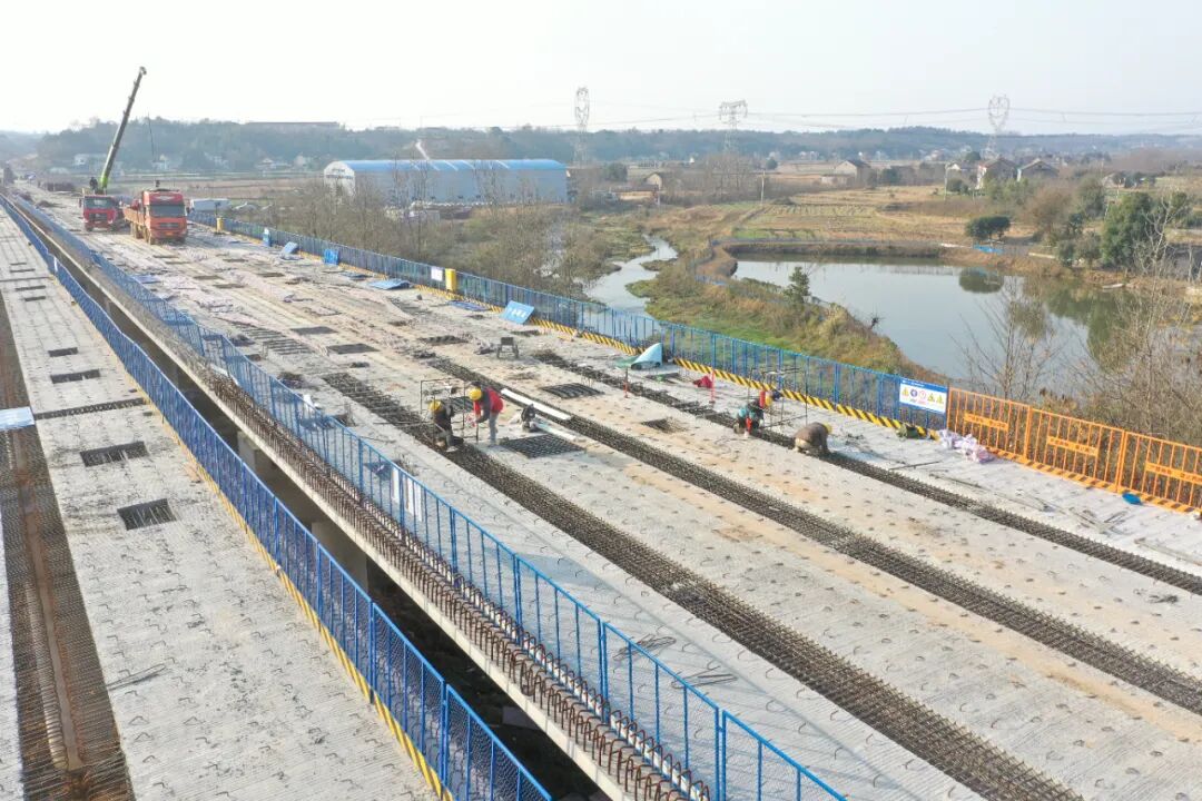 在当枝松高速6标段庙河大桥施工现场,一根根桥墩稳稳矗立着,笔直宽敞的桥面犹如一条纽带连接两岸。工人们正在进行桥面系焊缝连接、钢筋绑扎等工作,挖掘机、铲车、运输车辆等多种工程机械忙碌作业,建设者们争分夺秒抢抓进度。