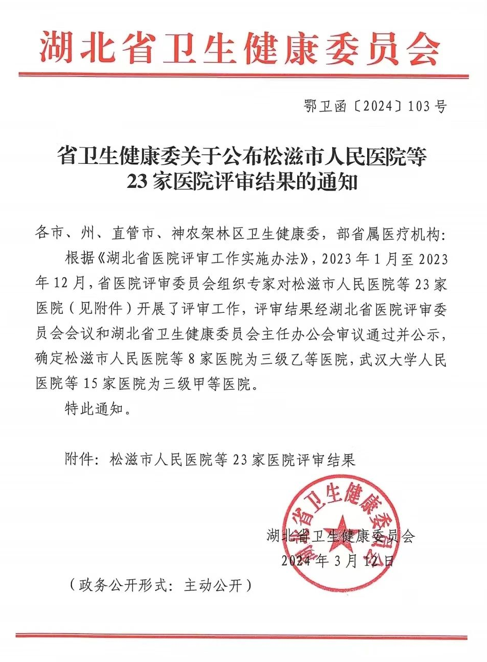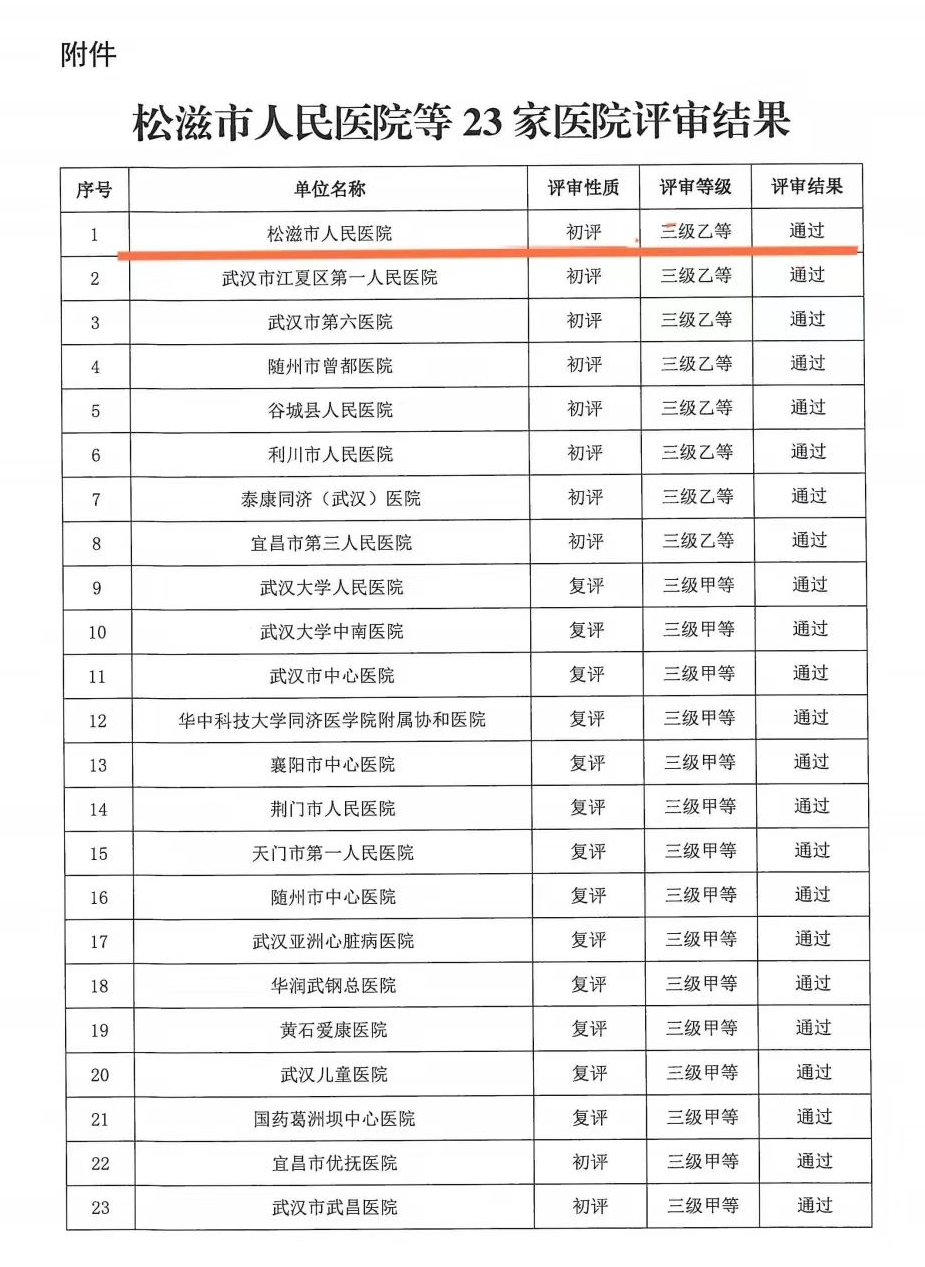 日前,记者从《省卫健委关于公布松滋市人民医院等23家医院评审结果的通知》中获悉,松滋市人民医院通过三级乙等医院评审。此次顺利通过评审,标志着市人民医院“三甲”创建工作迈出了关键一步。