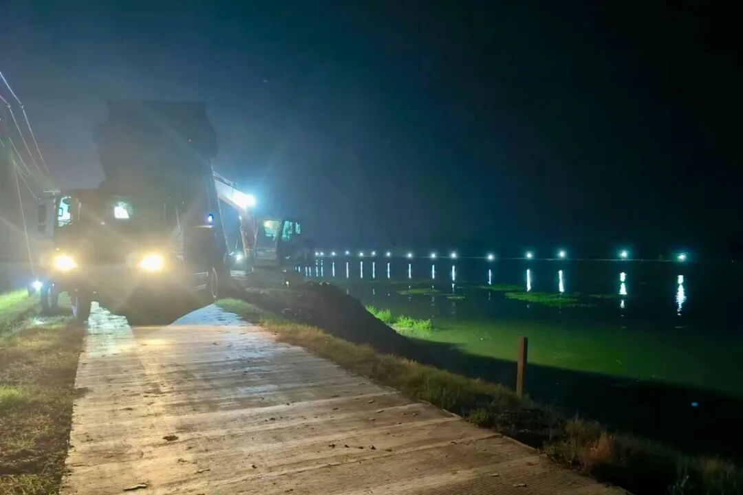 (记者 赵梦格)7月16日深夜,在老城镇庙河段河堤,渣土车、挖土车络绎不绝。市城管执法局工作人员正与值守人员积极夯实外堤,加固堤坝,现场一片忙碌。