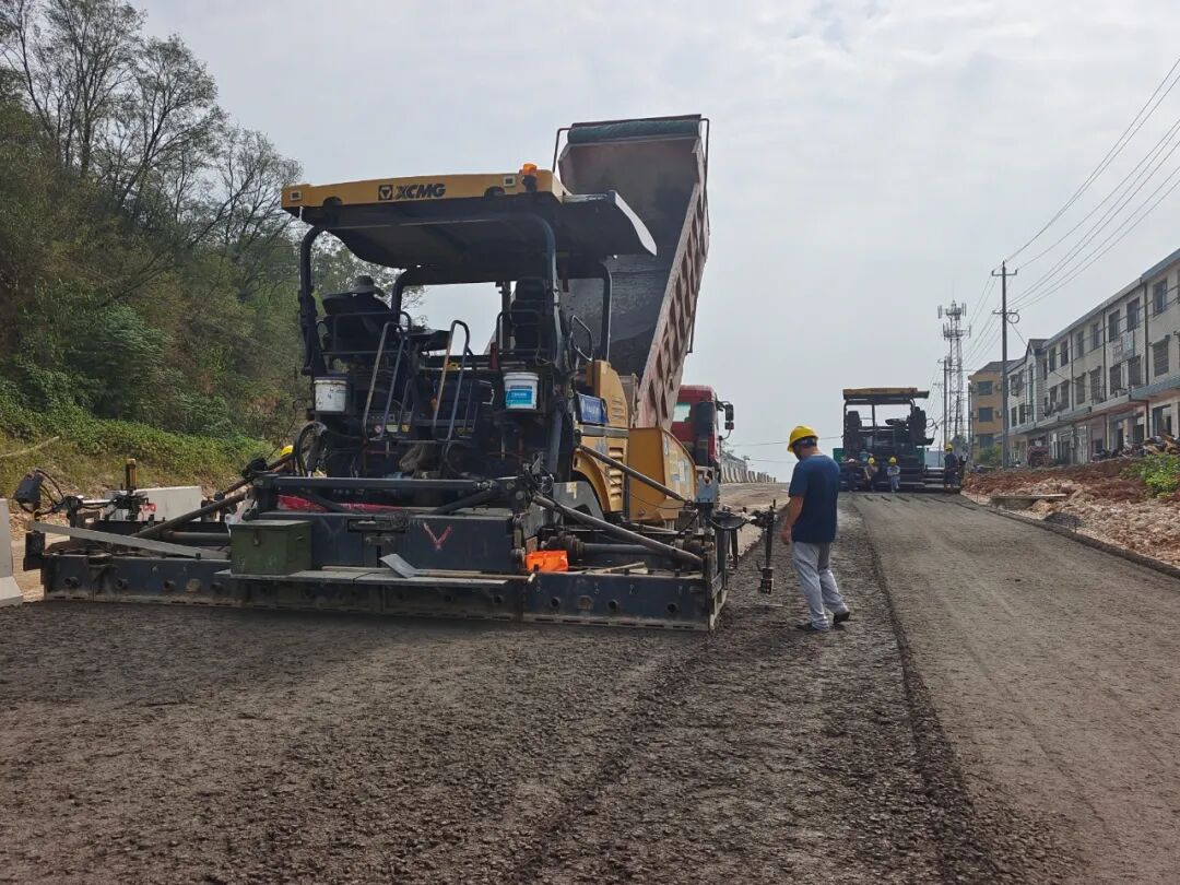 在麻水至火车站一级公路改建工程项目施工现场,水稳层混合料从大型装载车上倾泻而出,平地机将混合料不断向前推进,压路机随即来回碾压,工人紧跟其后进行平整,施工现场忙碌而有序。
