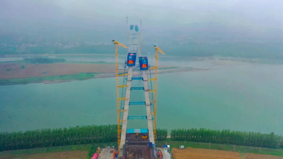 松滋河特大桥设计塔高169米,相当于60层楼高。2023年3月份开始进行第一节塔柱施工,截至目前已经完成主塔封顶,计划2025年年底大桥合龙。