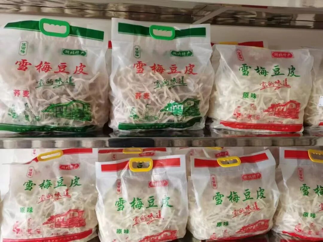 “雪梅豆皮”选用优质大米、精选荞米、高筋面粉按一定比例掺合在一起,用石磨碾成米浆,然后以小火慢烤而成。面皮摊凉后用快刀将面皮切成细条后晒干,这就成了千万家庭的美食豆皮。