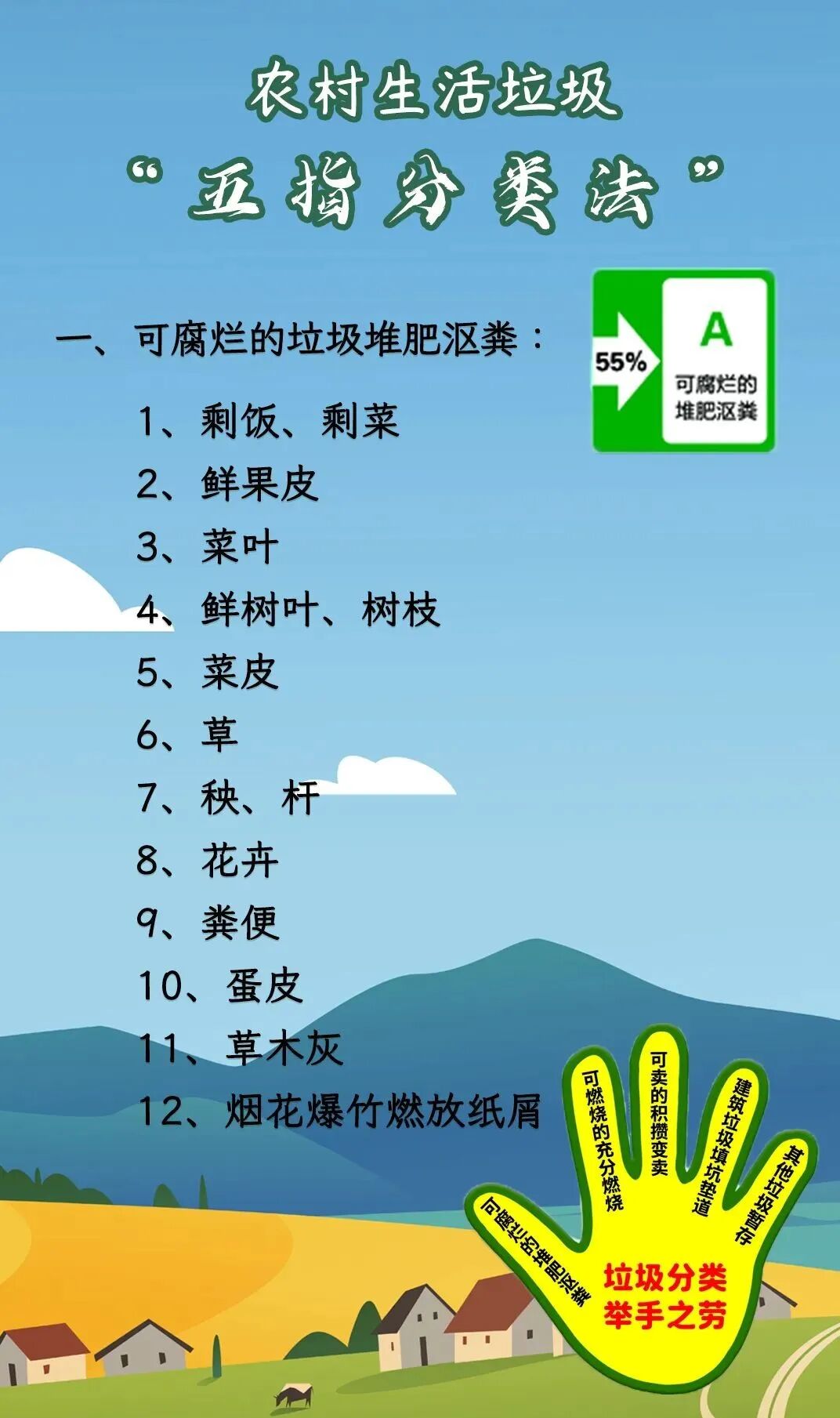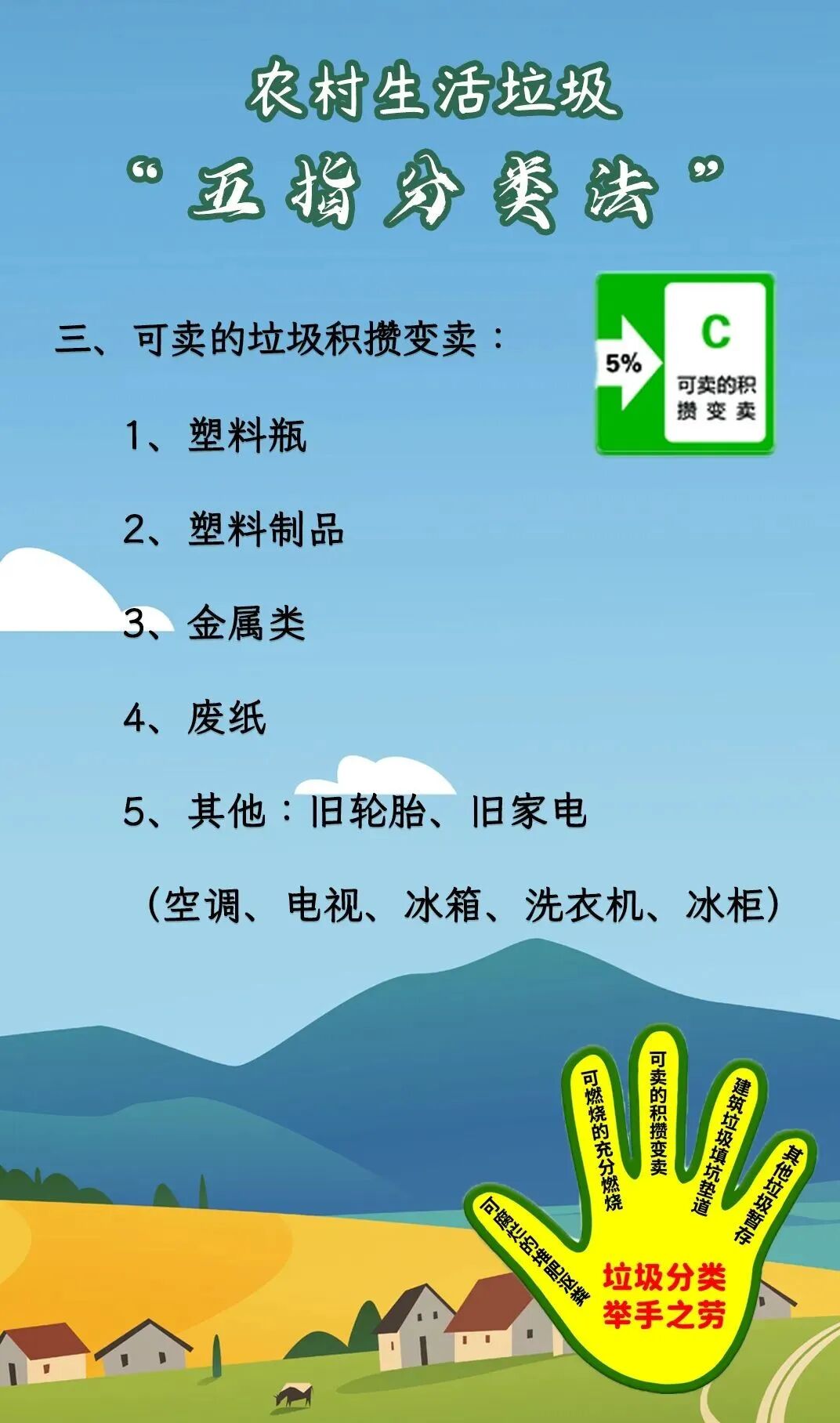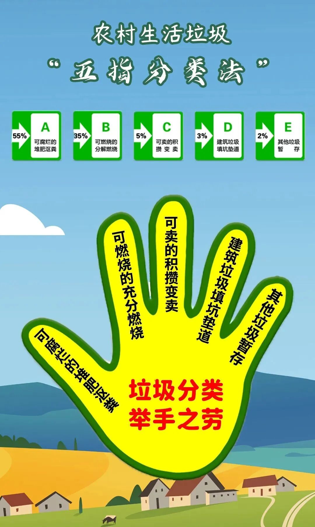 农村生活垃圾“五指分类法”即是将垃圾细化分类为可腐烂垃圾、可燃烧垃圾、可变卖垃圾、建筑垃圾填坑垫道、其他垃圾暂存。