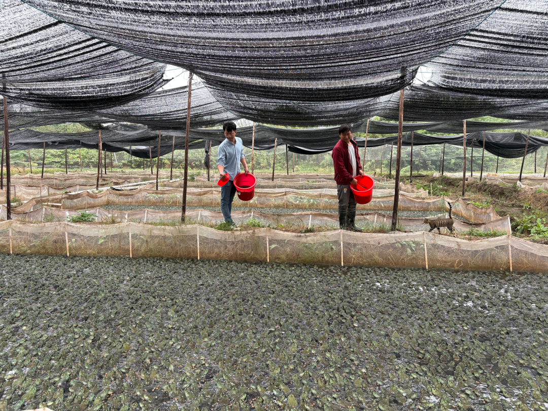 牛蛙养殖虽说门槛低,但对于水质和气候条件要求较高。基地采用活水循环养殖模式,并针对牛蛙不同的发育阶段进行分池饲养,以提高牛蛙的成活率,促进其快速生长。