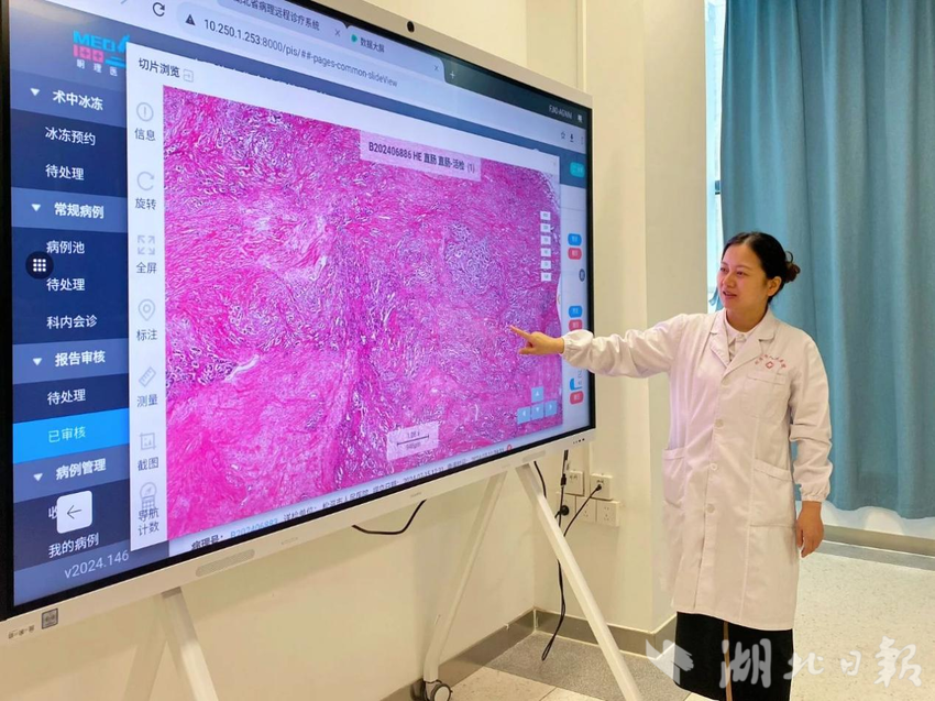 我市投资1030万元,配齐了数字化病理诊断设备,并升级了数字化病理诊断系统,实现了病理服务全流程数字化。借助信息化和AI工具,数智化病理诊断中心将市域内所有标本进行切片、全量扫描并上传至系统,建立了详细的“数字档案”,这不仅有效缩短了人工操作时间,还提高了病理诊断的效率和准确性。截至12月2日,该中心已完成切片扫描量14703张,在荆州县市区内排名前列。