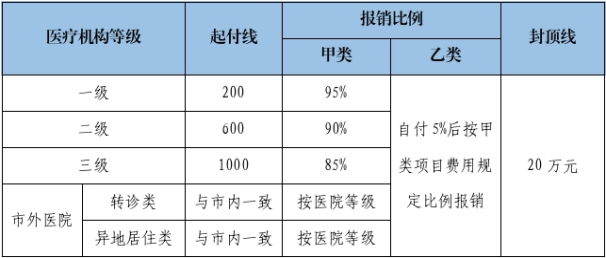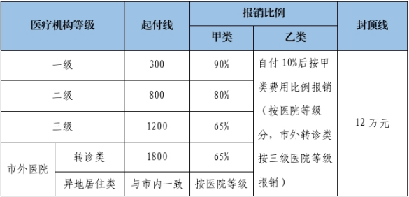 3.特困人员(含孤儿)、低保对象、返贫致贫人口:0.6~3万元报销65%;3~10万元报销70%;10万元以上报销80%,无封顶线。