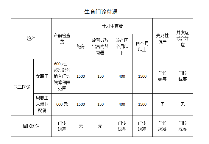 1.门诊待遇:每个妊娠周期的产前检查费生育保险支付额度标准600元,后续发生,超出额度之外的政策范围内医疗费用,纳入职工医保普通门诊统筹保障范围。满4个月流产1500元,不足4个月流产400元,实施绝育手术1500元,放置或取出宫内节孕器150元。