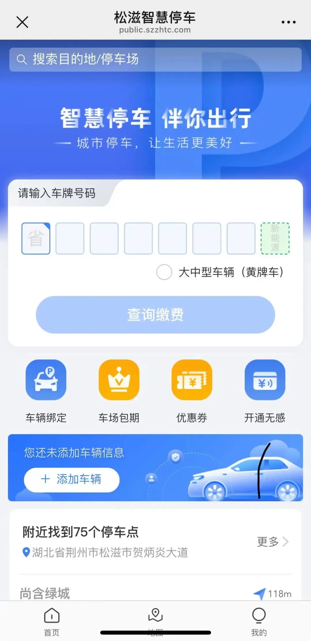 市民关注“松滋智慧停车”微信公众号,进入松滋市公共智慧停车平台,输入目的地,将显示附近停车场空余车位数,并附有导航地图和停车场收费标准,信息一目了然。