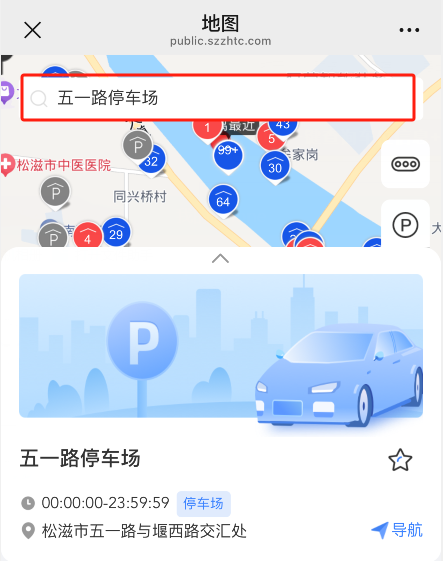 平台为市民提供“终点停车”服务,除超市外,公园、图书馆、医院等热门停车场,均可在平台查询。市民可以随时查询终点停车场状态,并一键导航至终点附近的停车场。
