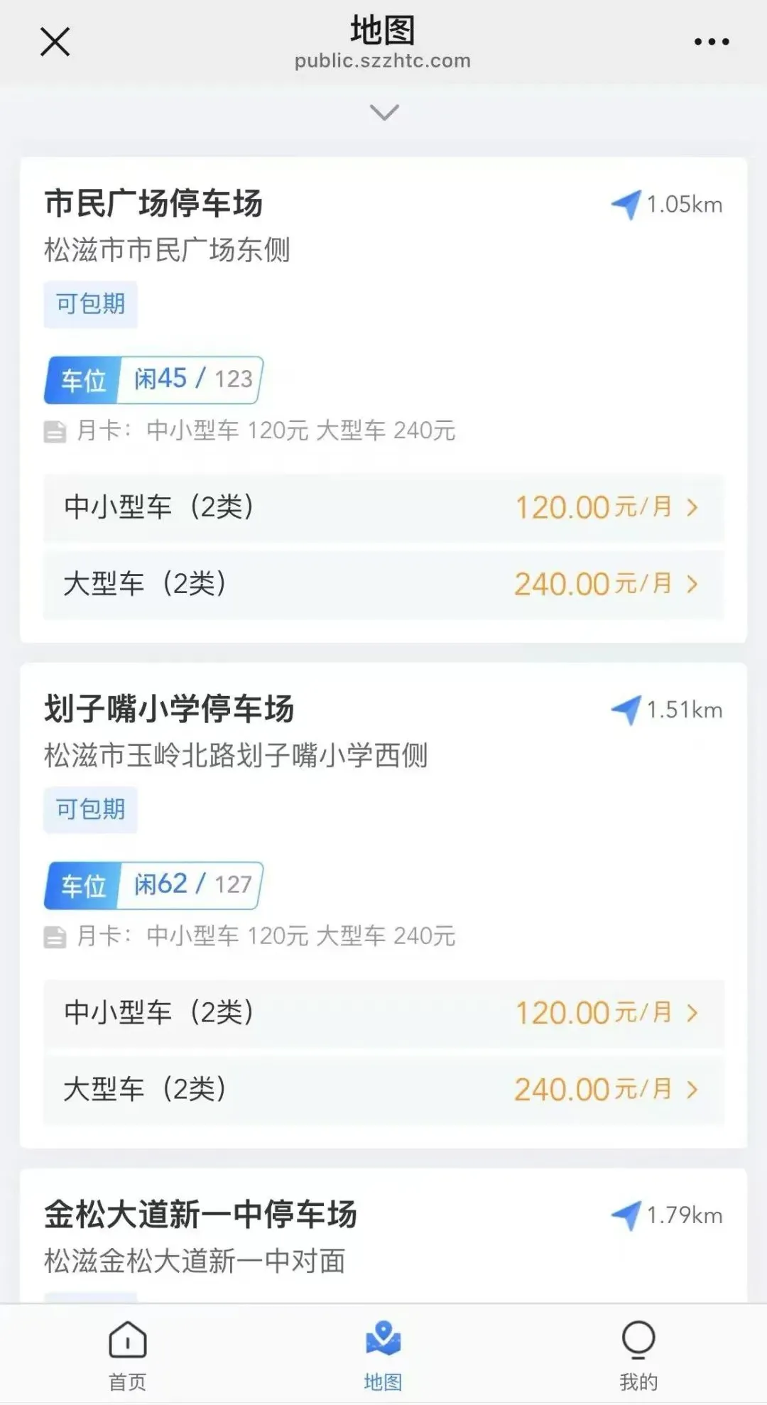 市民可结合自身需求,在公众号首页点击“车场包期”,选择停车场线上办理月卡,具体收费标准详见松滋智慧停车公众号。