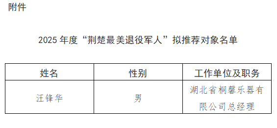 根据湖北省退役军人事务厅部署要求,将开展2025年度“荆楚最美退役军人”评选活动。通过逐级推荐和评选,拟推荐汪锋华同志参评“荆楚最美退役军人”。
