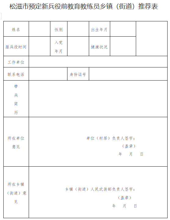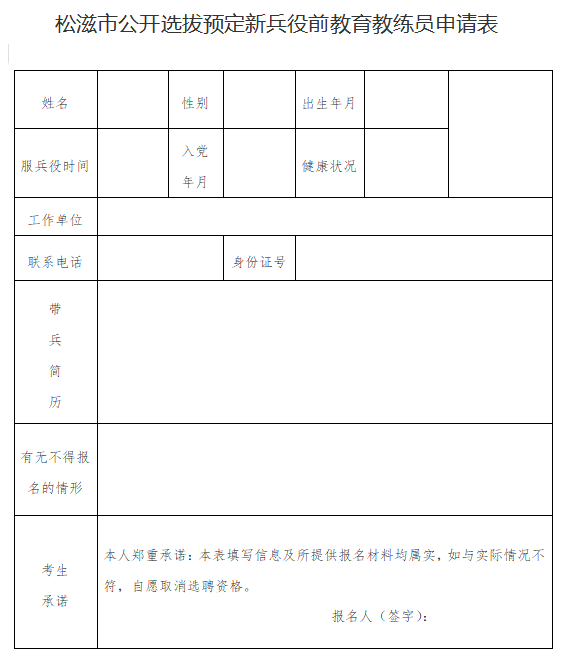 1.填报《松滋市公开选拔预定新兵役前教育教练员申请表》2份、《松滋市预定新兵役前教育教练员乡镇(街道)推荐表》2份(所在单位或村居、基层武装部加盖公章)、近期1寸同版彩色免冠正面照片4张;