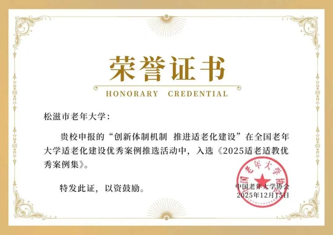(记者 周明强 通讯员 赵承亚)近日,从发布的全国老年大学适老化建设优秀案例推选结果中获悉,松滋市老年大学申报的《创新体制机制,推进适老化建设》,被推选为全国老年大学适老化建设优秀案例,并成功入选《2025适老适教优秀案例集》,成为全国50个优秀案例之一。