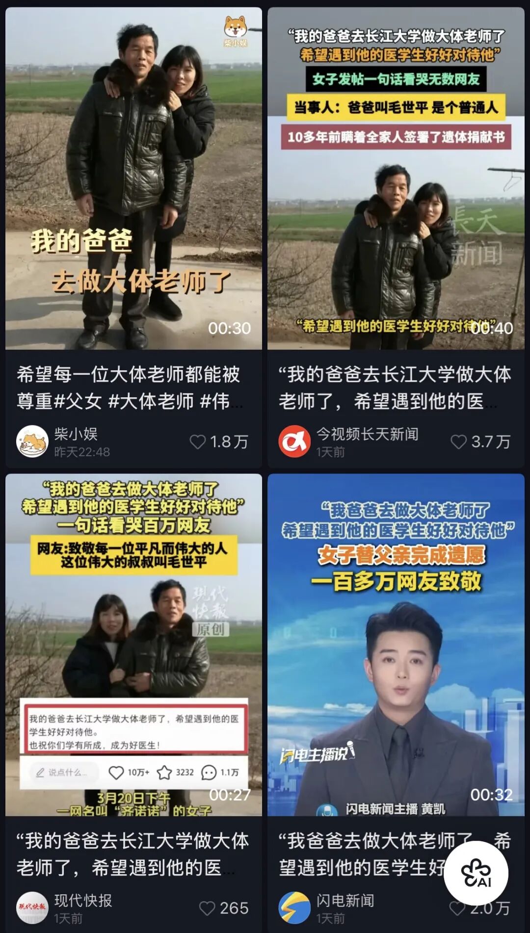 网友“齐诺诺”的父亲叫毛世平,松滋市沙道观镇人,一辈子靠养鱼卖鱼为生。在女儿的回忆里,父亲不怕苦、不怕累,朴实和善、风趣开明。10多年前,毛世平做了一个全家人始料未及的决定——捐献遗体,并给妻子和女儿做好了思想工作,家人虽万般不舍仍选择尊重他的决定。