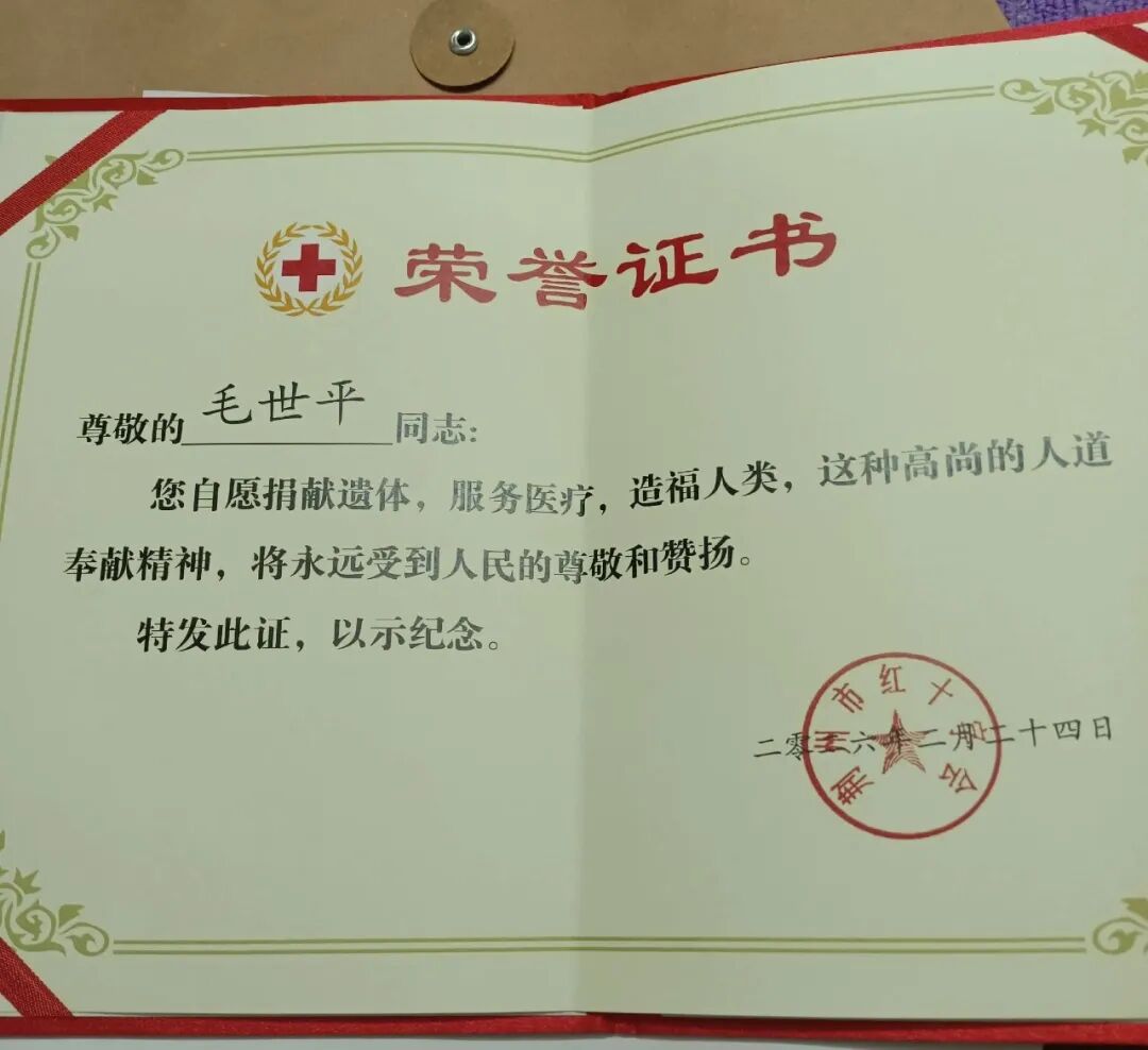 去年农历腊月二十五,老人突然离世。悲痛之中,家人没有忘记父亲藏在心底的愿望。第二天,他们联系了荆州市红十字会,完成遗体捐献手续,将老人的遗体送往长江大学,用于医学教学与科研。