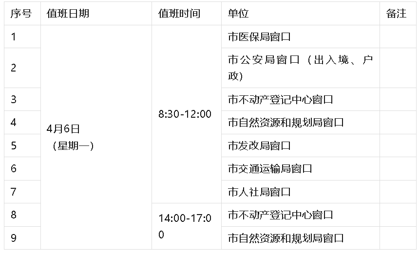清明假日期间,市政务服务中心开启预约服务,提高群众办事便利度。市公安局、市医保局、市不动产登记中心、市自然资源和规划局、市发改局、市交通运输局、市人社局等7个窗口将于4月6日错时值班,有需求的市民可提前预约。