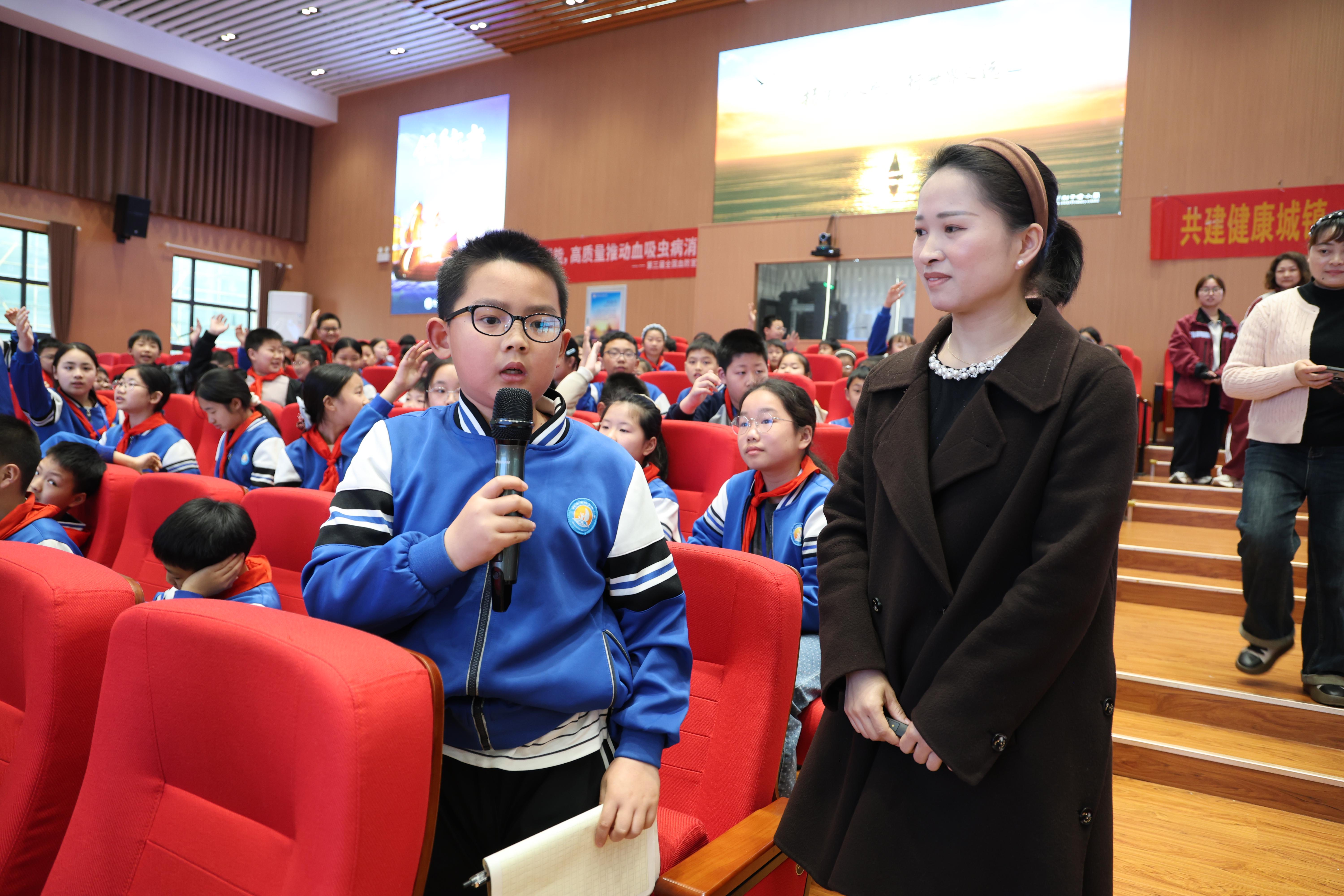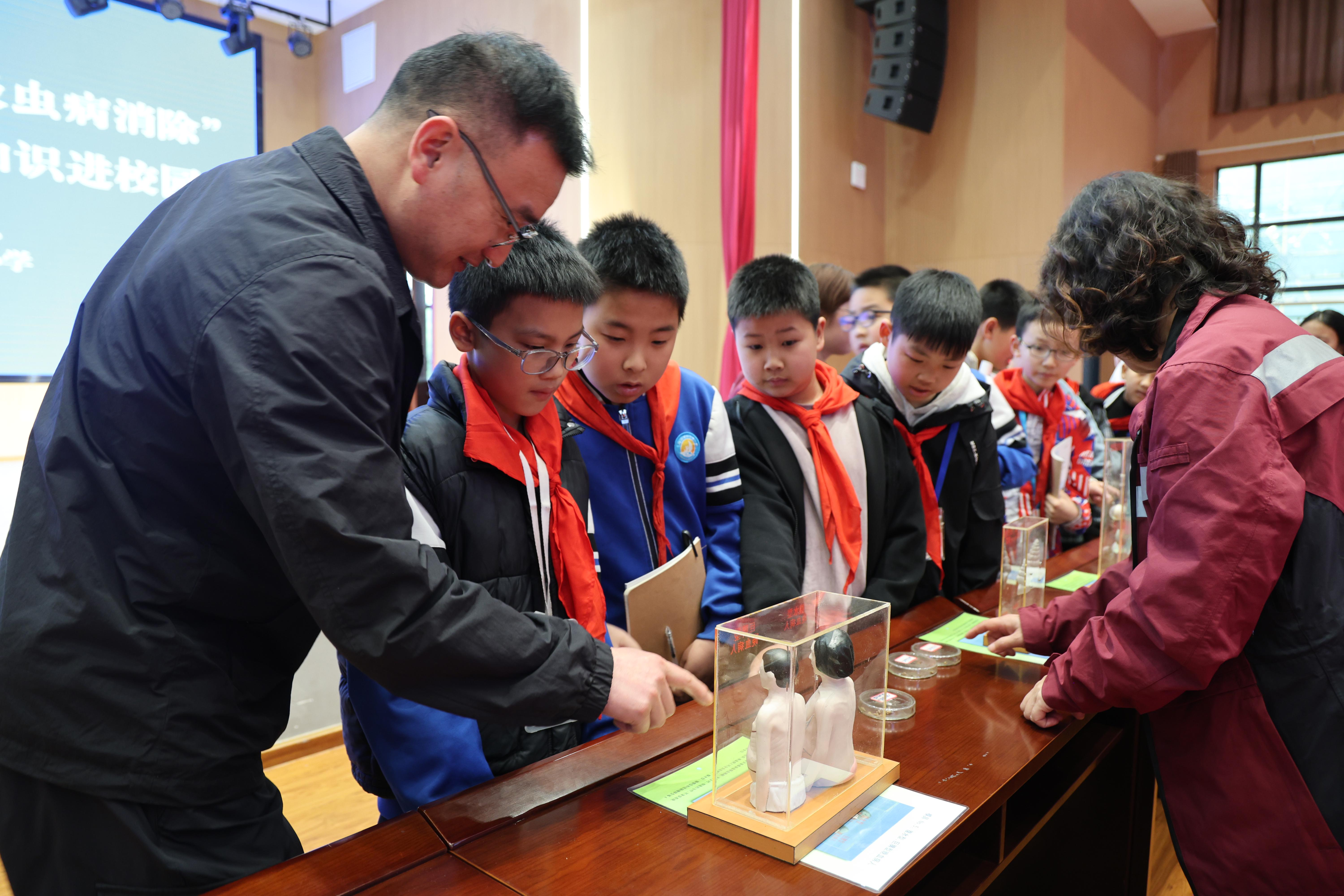 在血吸虫病防治科普环节,市疾控中心血防所讲师罗亚婕结合小学生认知特点,通过讲解课件、展示钉螺实物及血吸虫病脏模型等教具,将专业知识转化为通俗易懂的语言,全方位讲解血吸虫病的核心知识。从血吸虫的生活史、传播途径,到感染后的症状与危害,到“不接触疫水、做好防护、及时就医”的预防要点,工作人员逐一细致拆解,着重强调春季及夏秋季(4-10月)接触疫水的风险性,提醒师生在野外小河、池塘等不明水域活动时提高警惕,远离健康隐患。
