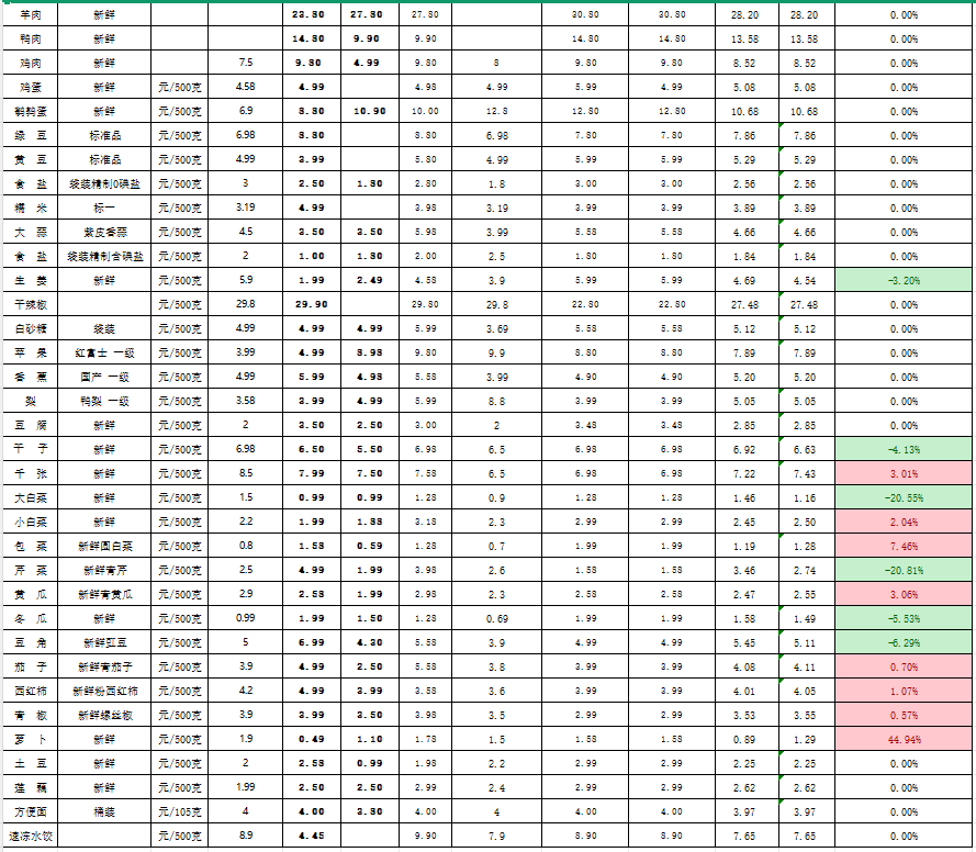 • 禽蛋:鸡肉、鸭肉、鸡蛋、鹌鹑蛋全部持平,鸡蛋均价5.08元/500克,价格亲民。