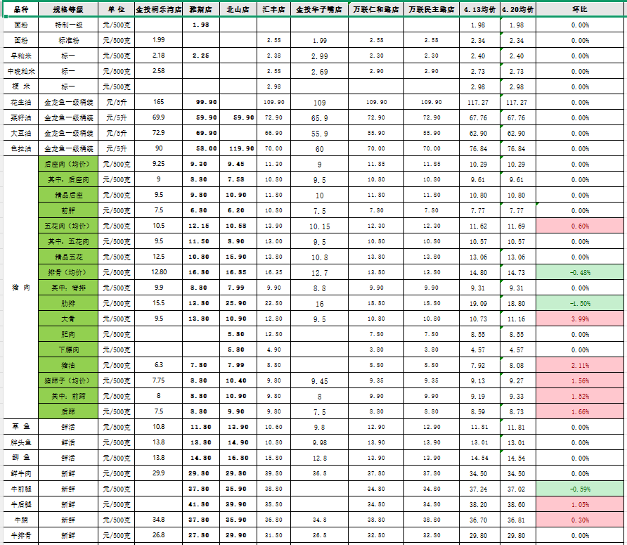 2026年4月20日从市发改局价格监测数据显示生活必需品价格整体粮油、蛋奶、水果、水产价格平稳;猪肉小幅波动;蔬菜涨跌分化明显,个别品种波动。