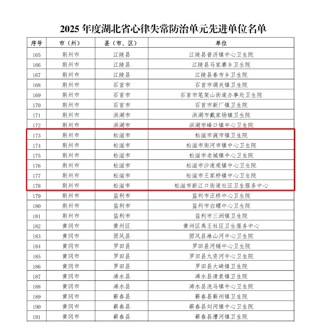(记者 张杰)日前,2026年湖北省心律失常防治研讨会在武汉召开。会议对全省心律失常防治工作先进集体进行集中表扬,我市涴市镇卫生院、街河市镇中心卫生院、老城镇中心卫生院、沙道观镇中心卫生院、王家桥镇中心卫生院、新江口社区卫生服务中心6家单位获评湖北省“2025年度心律失常防治单元先进单位”。