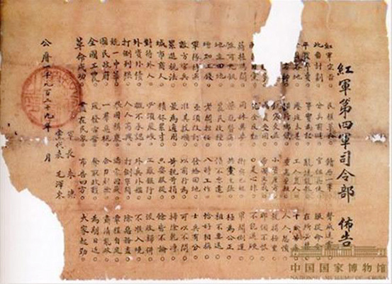 红军自井冈山向赣南闽西进军途中张贴毛泽东起草的《红军第四军司令部布告》,宣布红军的宗旨是:“民权革命,打倒列强,打倒军阀,统一中华。”宣传党的各项基本政策:“地主田地,农民收种,债不要还,租不要送。”“增加工钱,老板担任,八时工作,恰好相称。城市商人,积铢累寸,只要服从,余皆不论。”“敌方官兵,准其投顺,以前行为,可以不问。”布告以红四军军长朱德、党代表毛泽东共同署名,“朱毛红军”的名声因此在更广泛的地域内传开