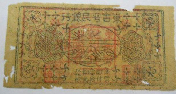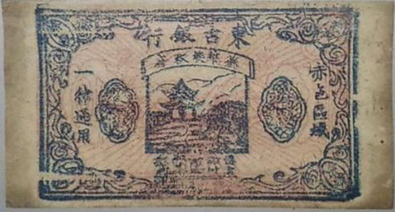 东固平民银行铜元票10枚券横12.8厘米、纵6.3厘米。正面图案、文字均为蓝色,其上端自右至左横书“东古平民银行”行名,中间图案为椭圆形内旭日冉冉升起,图案上盖有方形红色“东古平民银行之图章”印章,该章为3行竖读,主景左右两侧花形框内书面值“拾枚”字样,券面下方自右至左分5行竖印“凭票即付当拾铜元拾枚”10个字,券面四角花瓣内斜书“拾”字,票右侧有竖读“行字第 号”字样,其间数字为红色手书;背面图案、文字均为红色,中间花形框内对称印有“共同生产共同消费”字样,左右上方各有蓝色“东”字,下方右有“东古平民”、左有“银行之章”2枚蓝色方形印章,券背四角圆圈内斜书数字“10”。整个票面设计风格拙朴,制作简单