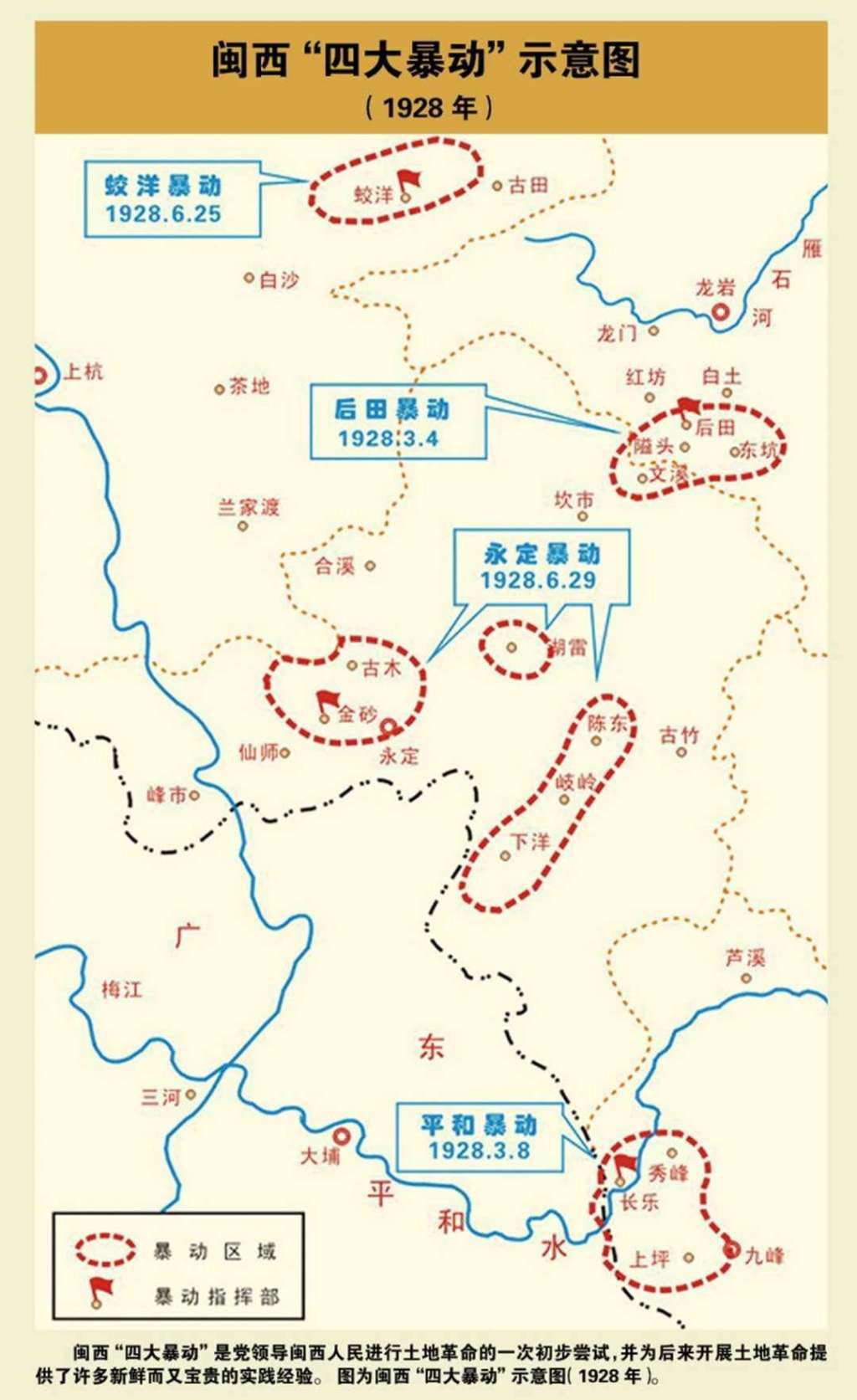 1927年11月,“八七会议”精神才传到闽西,12月5日,新成立的中共福建临时省委向全省提出了在乡村中领导农民“由抗租抗捐,一直到实行土地革命工农武装夺取政权,一切政权归苏维埃(工农兵代表会议)”的任务,开启了以武装斗争建立红色政权根据地的序幕。1928年初到6月间,闽西党组织相继领导了后田暴动、平和暴动、蛟洋暴动、永定暴动,但由于缺乏经验、土地分配不够充分,导致没能充分发动群众,政权未能建立,这几次暴动均被敌人镇压而失败。直至1929年3月,毛泽东、朱德领导的红四军从井冈山转战赣南到达闽西,闽西革命形势才开始扭转被动局面。