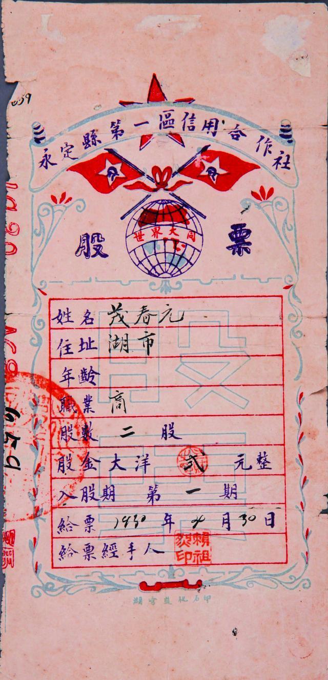 1930年4月30日永定县第一信用合作社发给茂春元的二元股票