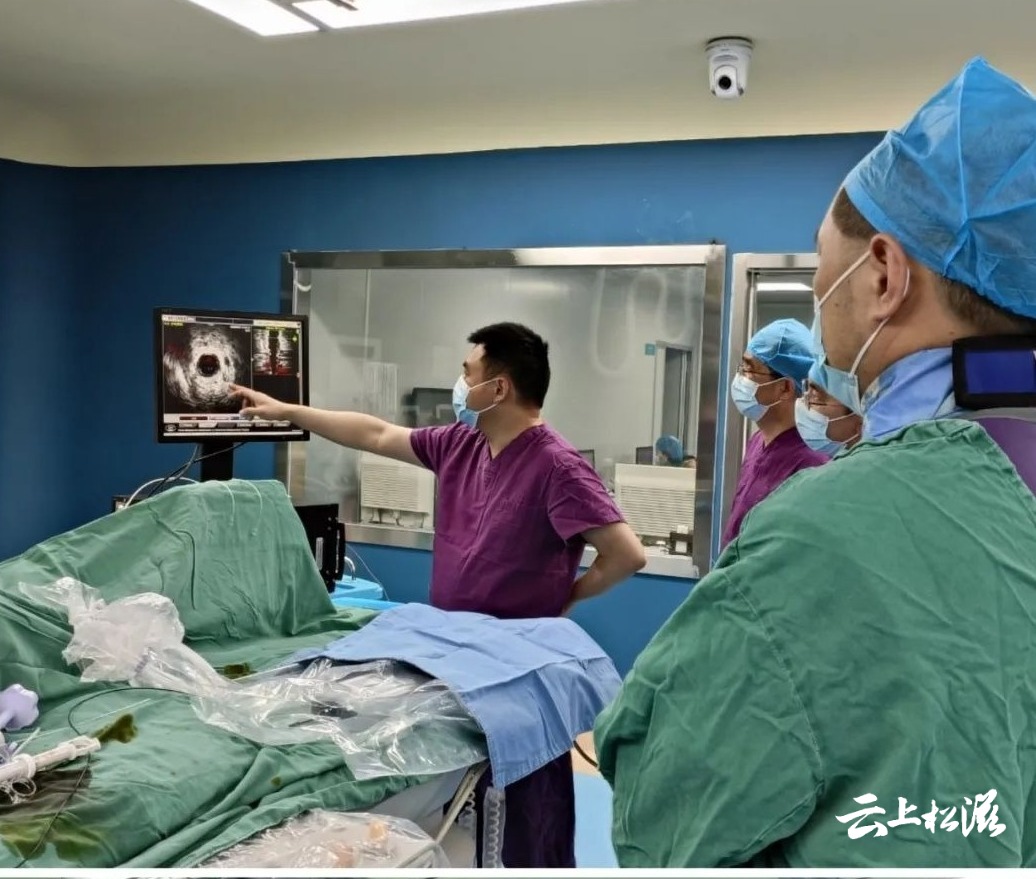 危急关头,武大人民医院派驻专家徐林教授带领市人民医院心血管内科李斌、肖闯、谭智勇等组成的介入团队,采用冠脉血管内超声(IVUS)技术,清晰显示出斑块、夹层和壁间血肿的大小及位置,为谈大爷精准植入血管支架。