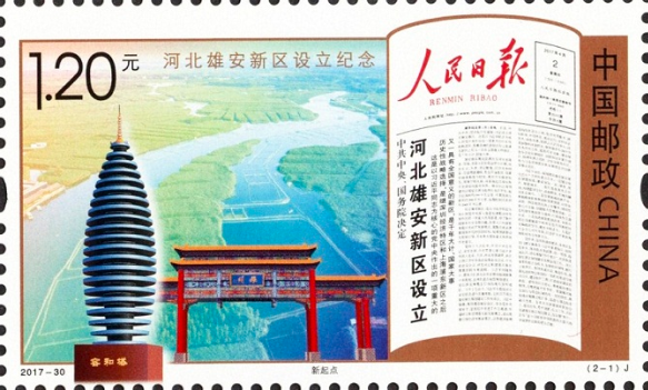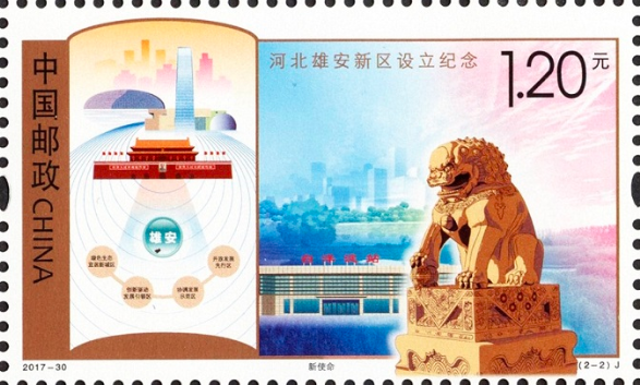 2017年4月1日,中共中央、国务院决定设立雄安新区,这是继深圳经济特区和上海浦东新区之后又一具有全国意义的新区。2017年12月22日,中国邮政发行《河北雄安新区设立纪念》纪念邮票,一套2枚,图案内容分别为“新起点”和“新使命”。用“起点”记录现在,用“使命”喻示未来。